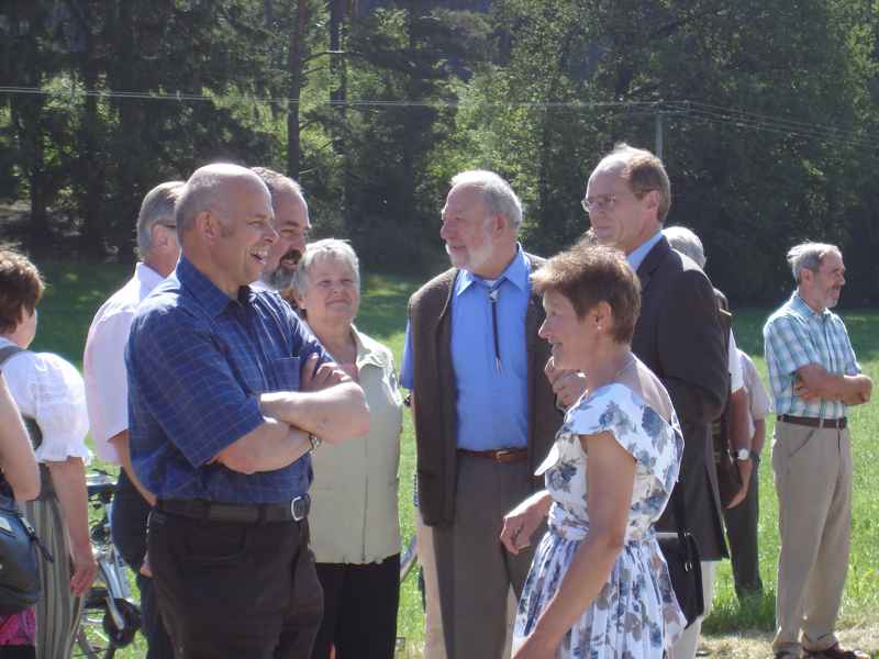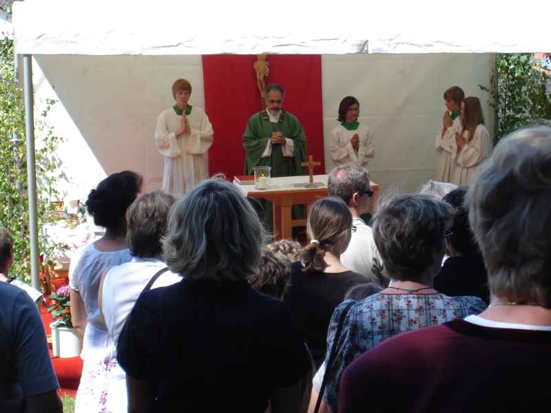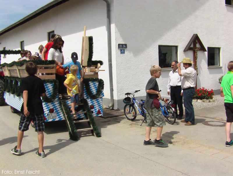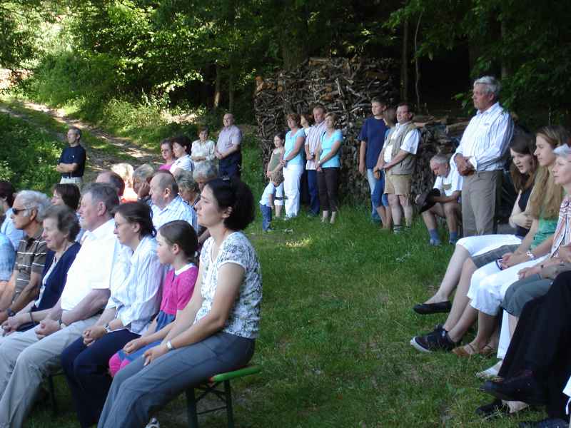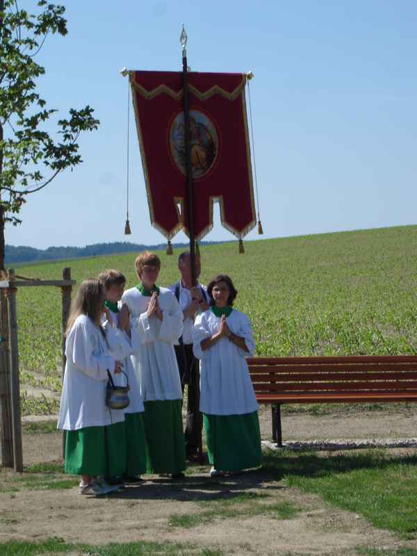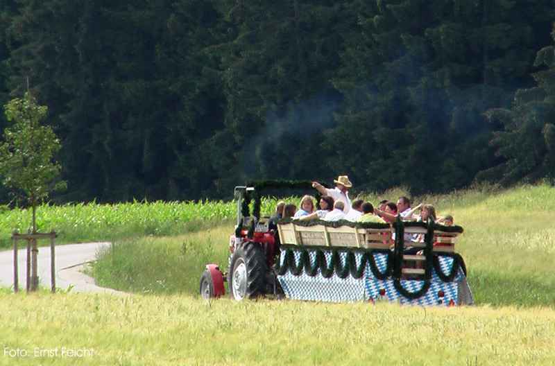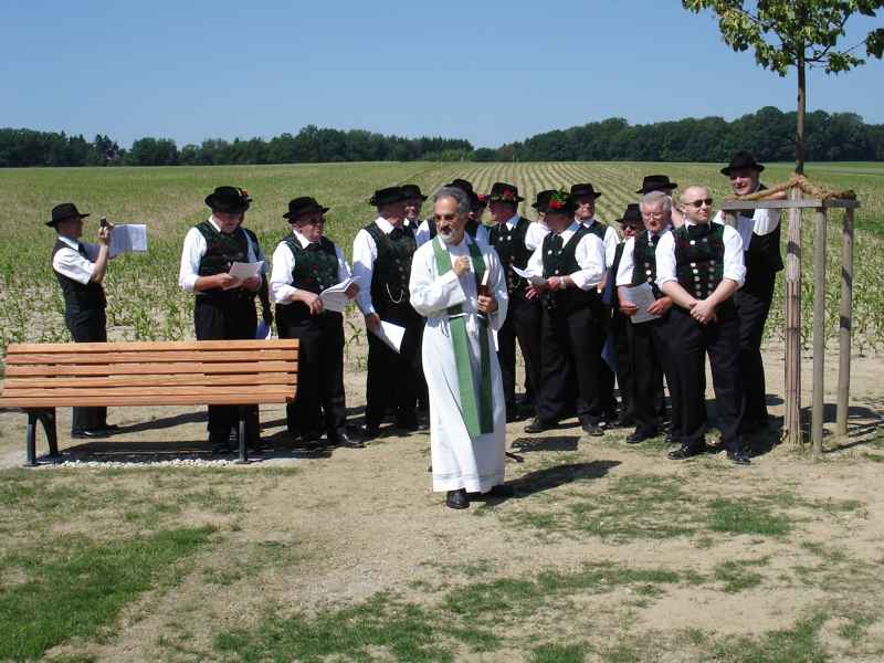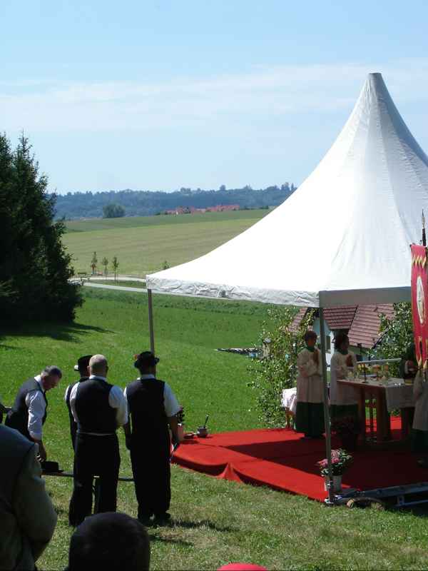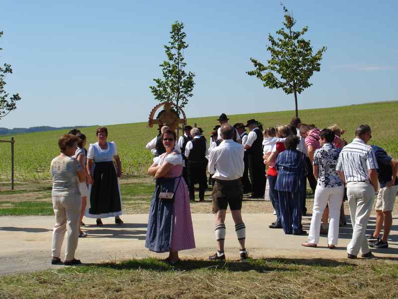 Dorffest 2009 Ein besonderes Fest sollte es auch diesmal werden, unser Hirschbacher Dorffest. Vorbehaltlich möglicher Einsprüche, wurde mit der Einweihung des neuen "Nuimerkreuzes", die Felderzusammenlegung in Hirschbach abgeschlossen.Aber der Reihe nach: Um halb elf Uhr wurden die Besucher des Dorffestes und der Kreuzsegnung mit anschließendem Gottesdienst eingeladen. Bei herrlichem Wetter formierte sich ein beachtlicher Zug zum dem ca. 200 Meter vor dem Ort gelegenen Platz für das neue Kreuz. In den vergangenen Wochen hatten Mitglieder des Arbeitskreises in Hirschbach mit viel Engagement sowohl den Platz mit den Bänken als auch das Kreuz neu errichtet. So konnte nun der Bürgermeister in seiner Ansprache vom langjährigen Werdegang der Felderzusammenlegung und auch von der wechselvollen Geschichte des "Nuimerkreuzes" berichten. Anlässlich des vorläufigen Abschlusses der Felderzusammenlegung erstellte das Amt für Ländliche Entwicklung ein kleines Heft, (1,8MB!) das auf dem Dorffest verteilt wurde. Nach der Rede unseres Bürgermeisters nahm Pfarrer Huber die Segnung des Kreuzes vor. Im Anschluss an die kleine Feier beim Kreuz ging es zurück zum Hang unter der Kirche. Ein wirklich schöner Platz für die Messfeier. Musikalisch umrahmt von der Amperthaler-Sängerrunde, die unter anderem auch einige bayerische Stücke zum Besten gab, konnte Prälat Huber wieder eine würdige Feier zelebrieren. In den letzten Monaten wurde auch die Fahne der Hirschbacher Kirche restauriert. Die Fahnenstange, die den Anforderungen nicht mehr standhielt, wurde bei der Gelegenheit auch erneuert. Im Rahmen der Messfeier erteilte Prälat Huber auch der "neuen" Fahne den kirchlichen Segen. Nach der Messfeier erwartete die Besucher im Niedermeierhof ein ausgezeichnet organisiertes Dorffest. Nicht nur, dass die Ausgabe der Essen im Vergleich zu den Vorjahren wesentlich zügiger von der Hand ging, auch wurden mit dem zusätzlich errichteten Zelt weitere schattige Plätze für ein gemütliches Zusammensein geschaffen. Als besondere Attraktion bot am Nachmittag Josef Haller Felderrundfahrten an. In seinem schön hergerichteten Wagen ging es recht gemütlich durch die neuen Fluren. Vor allem die ehemaligen Hirschbacher, die diese Gelegenheit gerne nutzen, waren voll der Anerkennung über das Geleistete. Wie schon in den vergangenen Jahren konnte durch den Einsatz vieler Dorfbewohner ein gelungenes Fest ausgerichtet werden. In den folgenden Tagen und Wochen wurde sogar mehrmals im Freisinger Tagblatt über die Segnung des neuen Kreuzes und unser Dorffest berichtet. Zurück zur Übersicht |