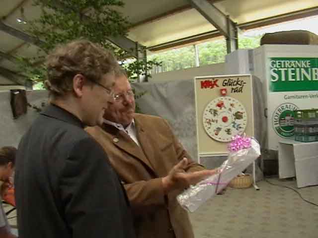 Aber jetzt der Reihe nach. Um elf Uhr war der Gottesdienst wieder an dem wirklich außergewöhnlich schönen Platz unter unserer Kirche angesetzt. Für unseren neuen Pfarrer, Herr Prof. Backhaus, war es die erste Messe in Hirschbach. Entsprechend angetan, wie ich meine, war er von der Atmosphäre in Hirschbach. Mit der Hoffnung, dass zukünftig vor allem die normalen Vögel und nicht noch mehr Stählerne den Gottesdienst begleiten, beschloss Hochwürden Backhaus die Messe ganz im Sinne der Anwesenden.