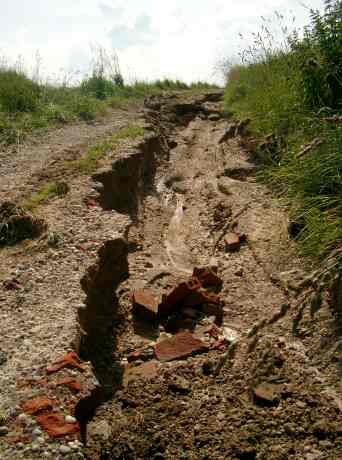 Hochwasser am 14. und 15. Juni 2005 Nach einem längeren Dauerregen Mitte Juni und dann noch einigen heftigen Schauern in der Nacht von 14. zum 15. Juni kam es zu einer größeren Abschwemmung der Feldstraße beim Eichbaum.Wie auf dem Foto zu sehen ist, wurde auf einer Länge von ca. 10 Metern die Straße halbseitig bis einen Meter tief aufgerissen. Auf Grund der zum Teil verschwemmten Verrohrung lief das Schlammwasser in die angrenzenden Höfe. Insbesondere der Geräteschuppen von Ludwig Springer bekam so über Nacht eine ca. 10cm hohe Schlammeinlage. Auch der Graben Richtung Kirchdorf war an diesen Morgen randvoll. Sicherlich hat auch an diesen Tagen die neue Verrohrung durch Hirschbach, die vor einigen Jahren im Rahmen der Kanalisation durchgeführt worden ist, schlimmeres verhindert. Sogar dem Freisinger Tagblatt war dieses Ereignis einige Tage später einen kleinen Bericht wert. Das Schwemmgut wurde Großteils in die Verrohrung des Hirschbach gespült. Bei einer Begehung einige Zeit später musste ab der Straße zum Eichbaum auf einer Länge von ca. 20Meter ein Kieseintrag von gut einem halben Meter Höhe festgestellt werden (s. untere Bilder). Zurück zur Übersicht |