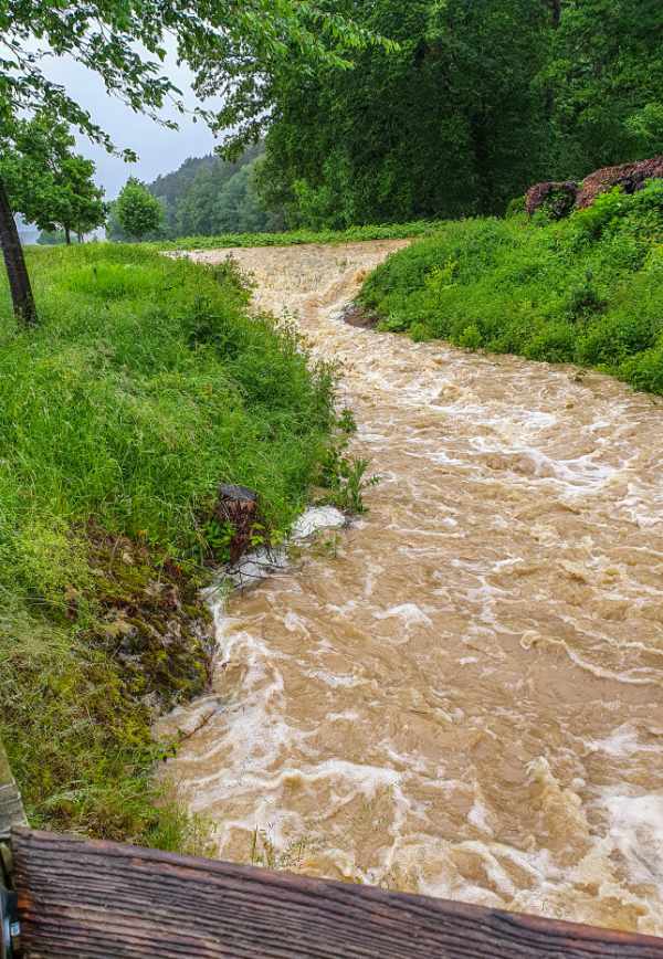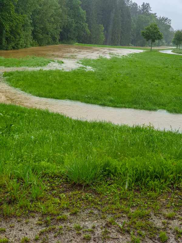 Hochwasser am 1. Juni 2024 Es war ja bereits seit Tagen vorhergesagt, es soll kräftig Regnen. Auch mit Hochwasser muss an Bächen und Flüßen gerechnet werden. Was ich messen konnte waren von Donnerstag (30. Mai) bis Samstag Nachmittag ca. 93 l/m2 und bis Montag Abend weitere ca. 27 l/m2. Im Nachhinein konnten wir in Hirschbach sagen: "Noch einmal gut weggekommen". Denn was da in manchen anderen Orten der Gemeinde, aber speziell in Allershausen, an Wassermassen daherkam, war gewaltig.Wie gesagt, wir hatten Glück. Aus meiner Sicht war dieses "Glück" aber in erster Linie auf unsere Rückhaltebecken zurück zu führen. Zumindest ich kann mich nicht erinnern, dass alle Rückhaltebecken rund um Hirschbach randvoll waren. Glück war dennoch dabei. Der Regen ließ just zu dem Zeitpunkt nach als unsere Rückhaltebecken übergelaufen sind. Man hat aber auch gesehen, dass zumindest an einer Stelle noch was getan werden kann. Bei der ersten kleinen Brücke von Hirschbach Richtung Kirchdorf staute sich das Wasser zurück. Damit konnte das Wasser nicht frei aus der Hirschbacher Verrohrung abfließen. Im Weiteren sollte auch mal überprüft werden wie es mit Ablagerungen (Kieseintrag) in der Hirschbacher Verrohrung aussieht. Fazit: Wie ich meine, haben uns diesmal die Rückhaltebecken vor einem Hochwasser im Ort bewahrt. Was aber auch für die Zukunft heißt, dass an der einen oder anderen Stelle nicht noch Handlungsbedarf wäre. Zurück zur Übersicht |
