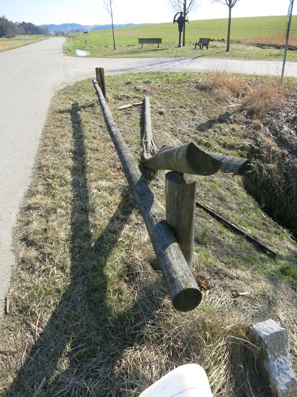 Brückengeländer am Nuimerkreuz Recht ramponiert sah das westliche Brückengeländer am Nuimerkreuz im Frühjahr 2017 aus. Der südliche Bodenpfosten ist über die Jahre doch schon deutlich "angefressen" worden. Sprich ist so etwa zu einem viertel abgefault. Das Bild war schon recht bemitleidenswert mit dem, auch abgefaultem, oberen waagrechten Stange.Im Protokoll der Gemeinderatssitzung vom Februar 2017 (der einmal verfügbare Link fuktioniert leider nicht mehr) war zu lesen, dass geplant sei das kaputte Geländer durch Leitplanken zu zu ersetzten. Auf Nachfrage war aus der Gemeinde zu hören, dass dies noch einmal geprüft werden solle. Aus meiner Sicht ist dies in unmittelbarer Nachbarschaft zum Kreuz keine tragbare Lösung. Dem Bemühen der Hirschbacher Dorfgemeinschaft für ein schönes Dorfbild wird damit sicher nicht Rechnung getragen. Zwischenzeitlich ist provisorisch ein neuer waagrechter Stamm auf den verfaulten Pfosten angebracht worden. Das mag für den Übergang durchaus in Ordnung sein. Aber man sollte sich doch eine Lösung ohne Leitplanken überlegen. Als Beispiel könnte auch das Geländer am anderen Ende der Ortschaft dienen. Aus meiner Sicht sieht das gut aus und ist auch sicher etwas Witterungsbeständiger als das aktuelle Geländer. Zurück zur Übersicht |