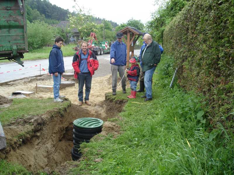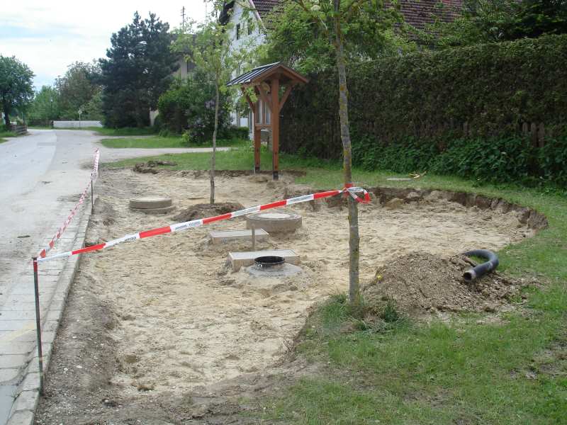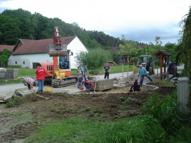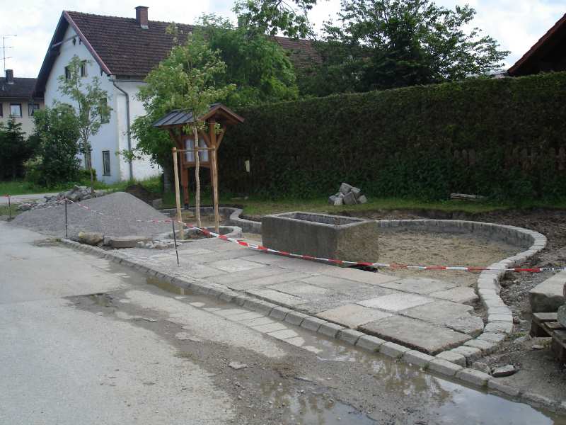 Ein Dorfplatz entsteht Nach längeren Planungen und Vorbereitungen des Hirschbacher Arbeitskreises wurde Mitte Mai mit der Versetzung der Gemeindetafel die Gestaltung des Dorfplatzes begonnen. Am 20. Mai schließlich half Groß und Klein zusammen, um die Arbeiten ein entscheidendes Stück voranzubringen.Um einen guten Untergrund für die später befestigte Fläche zu schaffen, wurde dabei die obere Erdschicht abgetragen und durch Sand und Kies ersetzt. Auch die Fundamente für den Brunnen wurden betoniert. Am Abend war dann der Platz für den Brunnen und auch das Aussehen insgesamt schon gut erkennbar. Am 26. Mai schließlich wurde der Wassertank für den Brunnen gesetzt und auch der Brunnentrog wurde an seinen endgültigen Platz gebracht. Um die schweren Bodenplatten richtig zu platzieren, war tags darauf vor allem die Muskelkraft der Helfer gefordert. Auch die Unterstützung durch Bernhard Mettenleiter, der mit Maschinen und Material erheblichen Anteil am Fortgang der Arbeiten hat, soll nicht unerwähnt bleiben. An einigen Juni Wochenenden wurde dann der Boden fertig gepflastert, das umgebende Gelände angepasst und bepflanzt. Am 09. Juli, dem Termin für das Hirschbacher Dorffest, soll unser Dorfplatz dann feierlich seiner Bestimmung übergeben werden. Zurück zur Übersicht |