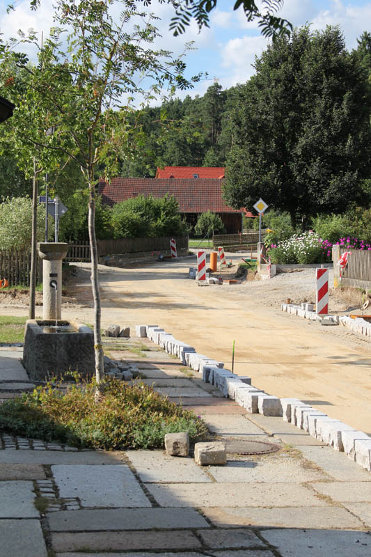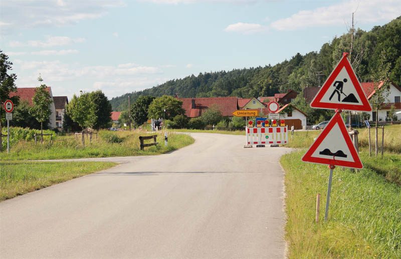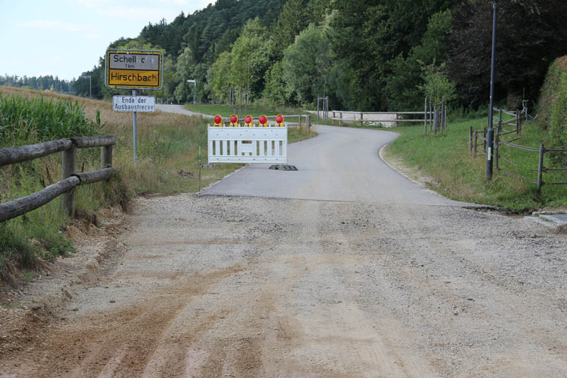 Etwa eine Woche nach unserem Dorffest war es soweit, die Bagger sind angerollt und haben das Erscheinungsbild der Hirschbacher Ortstraße erst einmal gründlich verändert. Seit Start der Bauarbeiten ist die Einfahrt aller die von Kirchdorf Richtung Hirschbach unterwegs sind wenig einladend. Wie auf den ersten Bild rechts zu sehen ist, ist die Durchfahrt verboten und eine Umleitung über eine für Autos verbotene Feldstraßen wird empfohlen.