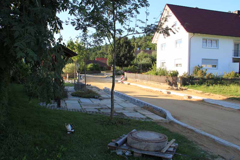 Mittlerweile, wir haben Mitte August, sind die Pflasterarbeiten nahezu abgeschlossen. Auch die diversen Fälle, in denen eine Korrektur der Planung notwendig war, sind mehr oder weniger bereinigt. Zur Freude aller Hirschbacher die in den vergangenen Jahren besonders unter den verschiedenen Hochwasserereignissen zu leiden hatten, ist der korrigierte Höhenverlauf der Durchgangsstraße von hohem Wert. Der neue Verlauf gewährleistet jetzt einen Wasserablauf zum Ortsanfang in den offenen Teil des Hirschbaches.