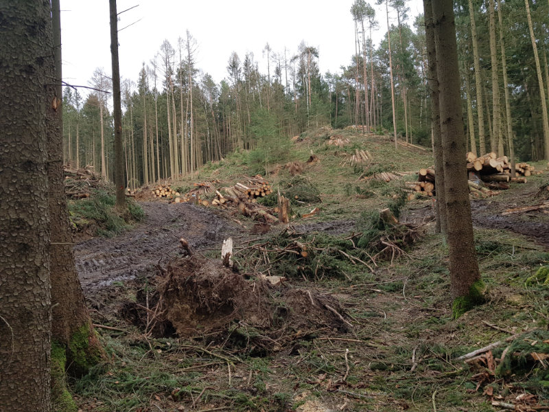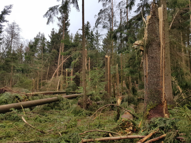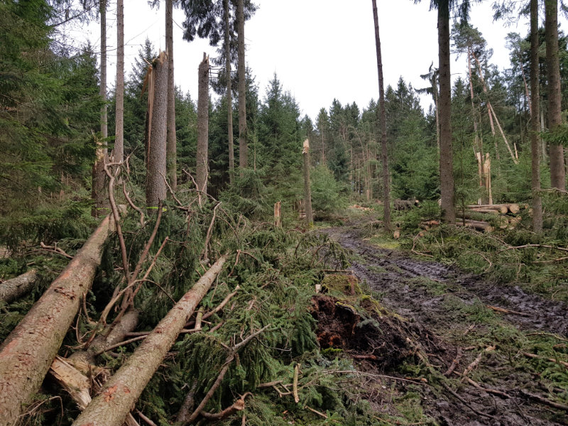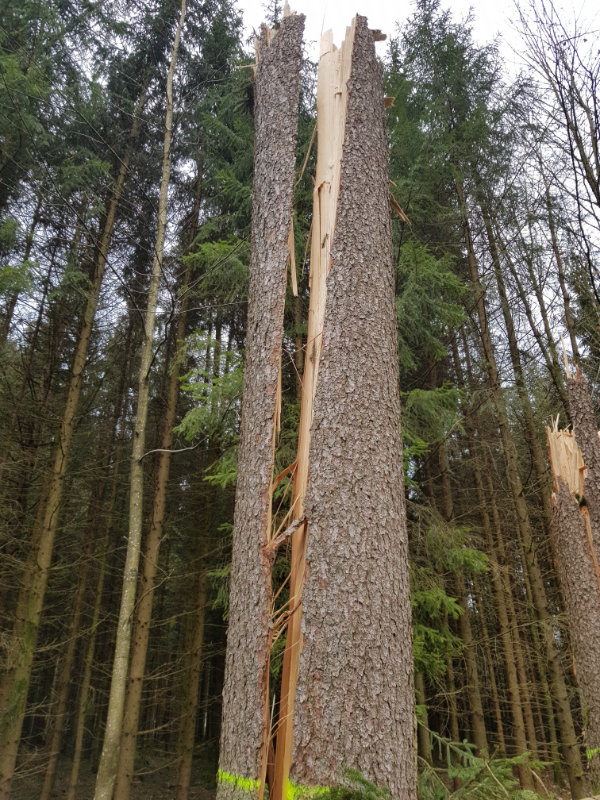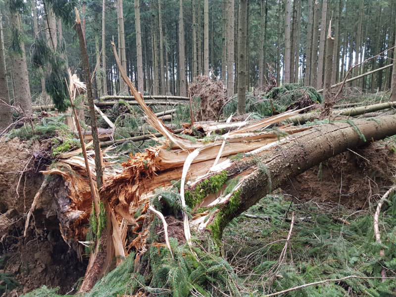 Sturmtief Sabine wütet im Hirschbacher Holz Die Wettervorhersagen zum 10. und 11. Februar 2020 verhießen nichts Gutes. Sturmtief Sabine war mit Spitzengeschwindigkeiten von weit über 100km/h im Anzug und richtete auch im Landkreis Freising zum Teil erhebliche Schäden an. Bereits im Vorfeld wurden viele Schulen im Landkreis geschlossen und, soweit möglich, sollten die Menschen zuhause bleiben. Wie gut diese Empfehlung war zeigte sich im Nachhinein. Neben zeitweisen Stromausfällen, etlichen Verkehrsunfällen, abgedeckten Dächern war auch der ein oder Baum umgestürzt. Von den vielen Zweigen und Ästen auf den Straßen und Wegen ganz zu schweigen.In Hirschbach waren zwar unter anderem einige (Gewächshaus)Scheiben zu Bruch gegangen aber in Summe waren die Schäden durchaus übersichtlich. Ganz anderes hatte der Orkan im Hirschbacher Holz gewütet. Größere Flächen Wald waren am Boden. Entwurzelte oder in der Mitte abgesplitterte Bäume zeigten von der Wucht des Sturms. Alles lag kreuz und quer. Er war schlicht kein Durchkommen mehr. Hier mit der Motorsäge aufräumen zu wollen, ein aussichtsloses unterfangen! Nur mit Großgeräten konnte am vorhandenen Chaos gearbeitet werden. Der eingesetzte Havester (Waldvollernter) war Wochenlang beschäftig wieder etwas Ordnung zu schaffen. Fast den ganzen Sommer über lagen am Waldrand ware Berge Holz das auf den Abtransport wartete. Die Schäden der Waldbauern sind sicher ganz erheblich. Vielleicht ein gutes kann man den Ganzen abringen. In den mittlerweile durchgeführten Aufforstungen sind vor allem klimaverträglichere Sorten wie zum Beispiel viele Laubbaum Sprösslinge zum Einsatz gekommen. Anstatt der Fichten Monokultur können sich künftige Generationen wieder an einem Mischwald erfreuen. Zurück zur Übersicht |