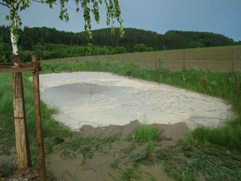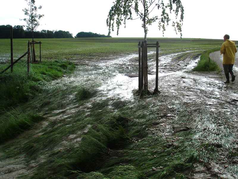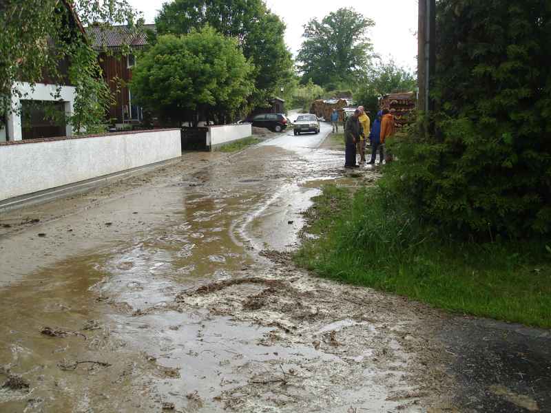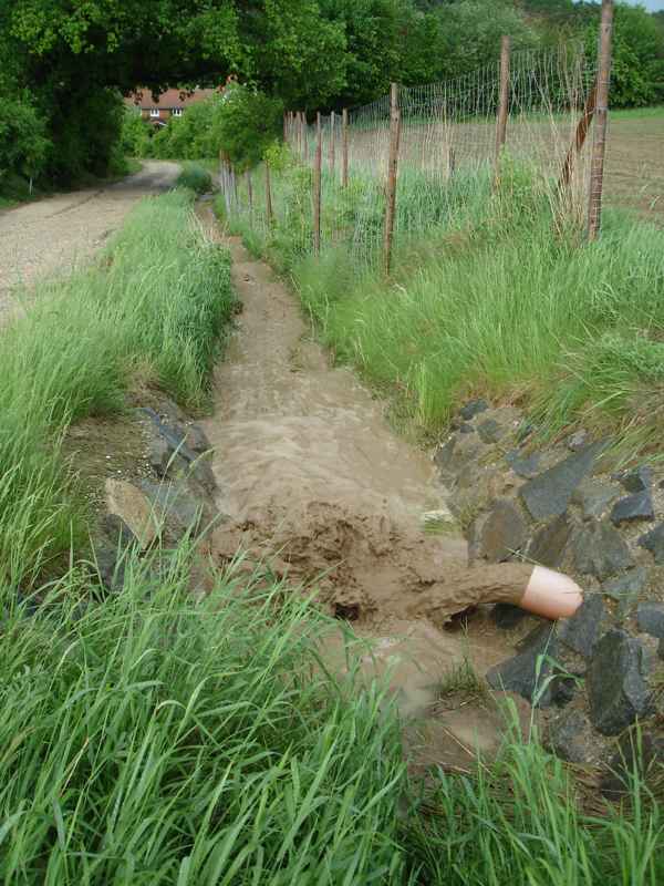 Vatertagsgewitter Eigentlich ist so ein heftiger Gewitterregen nach einem schwülen Tag wie an diesem Vatertag 2009 nichts Besonderes. In so einer Situation sollten sich eigentlich die Rückhaltebecken an der Straße beim Eichbaum bewähren. Es sollte dann doch anderes kommen als angenommen.Anstatt dass die Becken vollgelaufen sind, lief das schlammige Wasser über die Felder und der Straße und sammelte sich an der Einfahrt zur Dorfstraße. Nachdem offensichtlich auch die beiden Einläufe zum Hauptrohr zu klein ausgelegt sind, waren die Anlieger schnell dazu genötigt die jeweiligen Einfahrten zu versperren. Die Ergebnisse waren: Nur teilweise gefüllte Rückhaltebecken und eine dicke Schlammschicht an besagter Einfahrt zur Dorfstraße. Als Fazit bleibt, dass zum einen der Zulauf zu den Becken wohl noch einmal überdacht und angepasst werden muss, und zum anderen auch die beiden erwähnten Einläufe durchaus größer sein dürften. Und nicht zuletzt würden breite Grasstreifen an den Rückhaltebecken und zur Straße hin den Schlammeintrag in die Becken und auch in den Ort reduzieren. Zurück zur Übersicht |